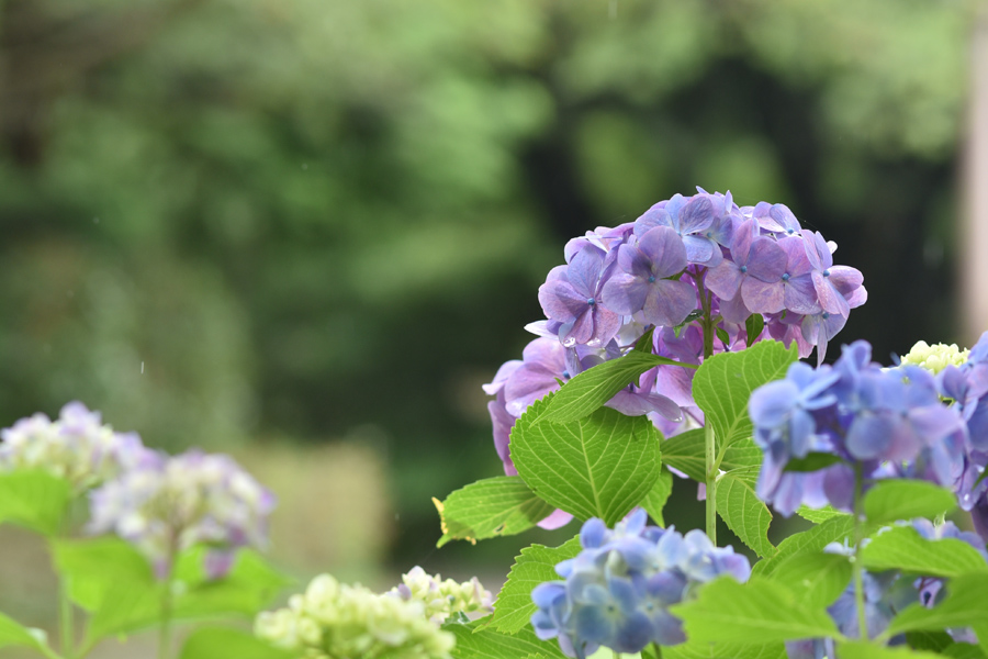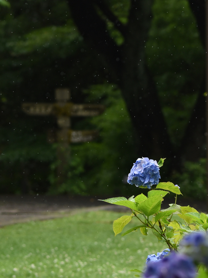 先週に引き続き雨の写真です。撮影場所は近所の公園です。この公園にはアジサイが植えてあるのでアジサイを撮るつもりで行ったのですが途中で雨が降ってきたので、ついでに雨とアジサイの写真も撮ってみた、というわけです。近所には他にも川沿いにアジサイを並べて植えてある場所などもあるのですが、開けた場所に一列になべて植えてあるとアップを撮るにはよくても写真に変化がつけにくいというデメリットがあります。この公園のほうが雨や周りの緑と絡めて撮るには適しているので、アジサイの数は少なくても私はこの公園に来ることが多いです。人にはそれぞれ好みがありますが、私の場合、自分好みの色のアジサイがあるかどうかも撮影場所を決めるポイントになります。アジサイと雨、絶対に似合う組み合わせですので試してみてください。