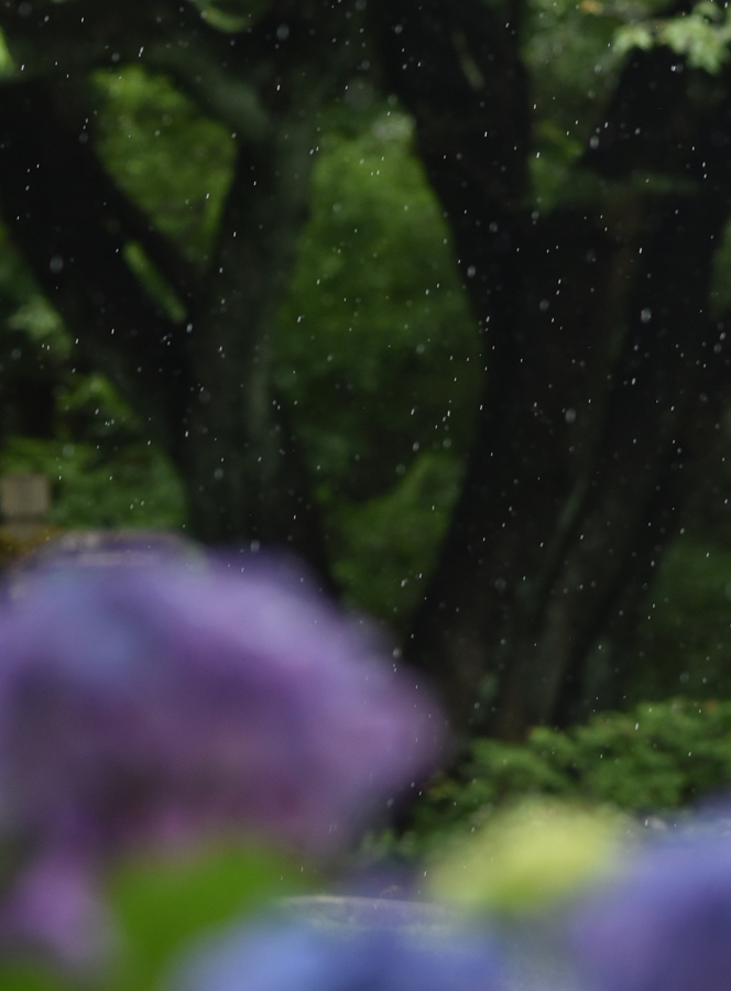 つまり、アジサイにピントを合わせると、後ろのほうに振っている雨にはピントが合わないため、写りにくくなってしまっているのです。