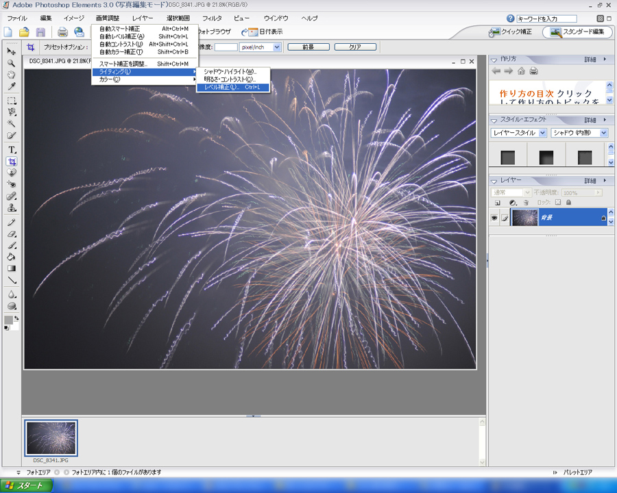 今回はレベル補正で調整しましたが、「コントラストと明るさ」または「シャドウ ハイライト」で調整しても似たような効果を得ることができます。その写真に適したほうを選んで使ってください。花火の写真の場合はコントラスト強めのほうがきれいに見えるので、画像を加工するときはハイライトとシャドウをはっきりと出すようにする方向で調整するといいと思います。