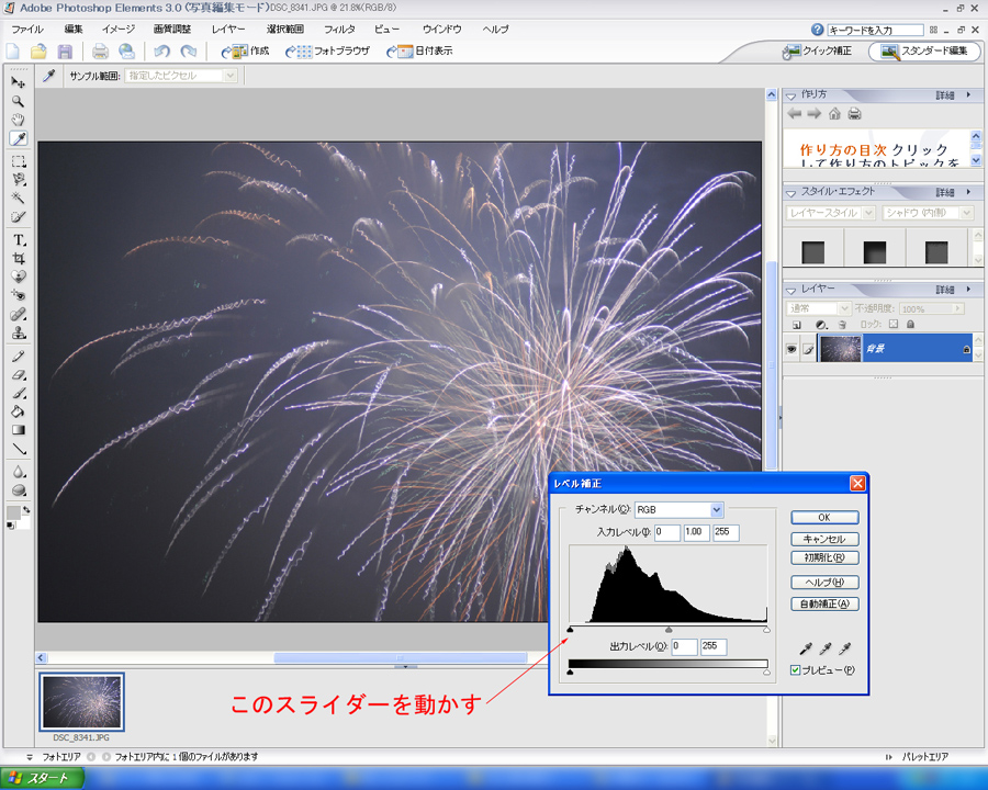 今回はフォトショップエレメンツを使いました。ほかのソフトでもコントラストがいじれるものであれば同じような補正が可能ですのでやってみてください。まず撮影したそのままの写真が作例1です。前の花火の煙が完全に消える前に上がった花火を撮ったため、夜空に残った煙のせいでちょっとぼんやりと眠い感じになってしまっています。これをエレメンツで立ち上げてライティングを選択し、さらにレベル補正を選択します。(作例2) レベル補正シャドウ側のスライダーを右に動かすと黒が締まるので、ちょうどよいと思うところまで動かします。(作例3)さらに中間調を明るくしたり、暗くしたりするには真ん中のグレーのスライダーを動かします。ここでは少し右にスライドさせて中間調も少しだけ暗くしました。この結果が作例5です。