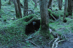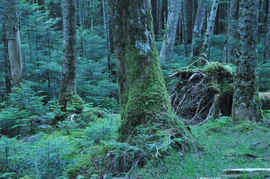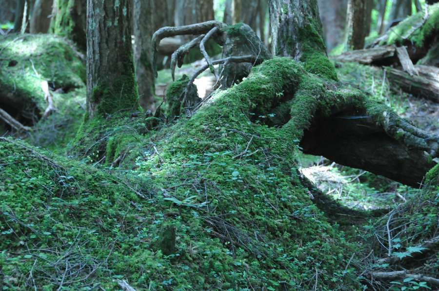 何しろ森の中なので暗いということは覚悟しなければなりません。この時は一眼レフと明るめのレンズを用意していきました。苔が有名な森なので、下に生えている苔と苔むした木の幹を中心にフレーミングしてみました(作例1)。この時、長女も一緒に写真を撮っていたのですが、自分のカメラのモニターを見ながら「ママ、なんかこの赤いのが気持ち悪い」と言いました。長女はWBをオートにして撮っていました。そのため画面全体に緑が多くなるこのような場所では色をやや赤っぽくなるようにカメラ側で勝手に調整されてしまい、もともと赤みがかった木の幹や土の色が余計赤っぽくなってしまったようです。作例1はWBを太陽光に設定しているので、「気持ち悪い」というほどの色にはなっていませんがここは暗く静かなイメージを出すためにWBをタングステンに設定して全体に青っぽい色になるようにしてみました(作例2)。見た目の色とは違いますが、違和感のない範囲だと思います。暗く静まった森のイメージに青はよく似合うと思います。