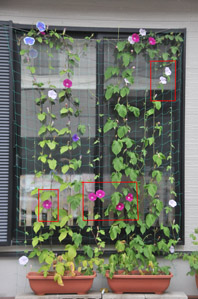 作例1は全体の様子です。赤枠で囲ってある花は他の作例で撮影した花です。まずは正面から撮ってみます。花が集まっているところを探すと赤枠の中の赤い花が4つ集まっているところが良さそうです。上のほうにも赤と白の花が集まっているところがありますし、左上の青い朝顔も気になるのですが、こんなに高い場所だと正面から撮ることができません。赤枠の中の四輪でフレーミングしたのが作例2です。四輪の配置に気を付けてフレーミングしましょう。画面いっぱいにギリギリはいるようにアップにしてしまうと窮屈な印象になってしまうので、上下左右に少し余裕を持ってフレーミングします。