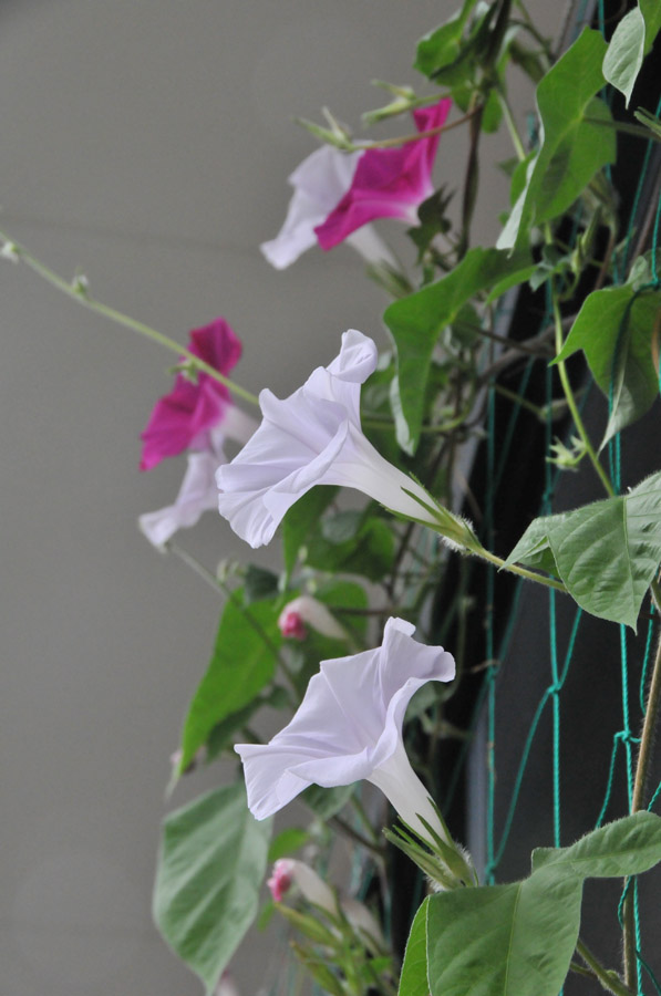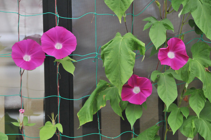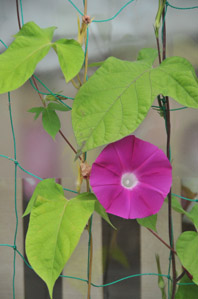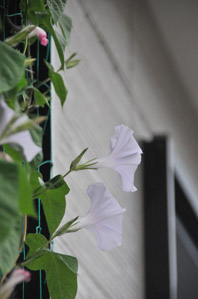 一輪をアップにして撮る場合はなるべく日の丸構図にならないように中央をはずしてフレーミングしましょう(作例3)。背景になにか意味を持たせる場合は別ですが、今回は窓をネットで覆ってそこにつるをはわせているので、背景は窓ガラスです。この状況の場合背景にこれと言って良い素材はありません。こういう場合は日の丸構図は避けたほうが無難です。中央に朝顔をフレーミングして撮ってしまうとなんだか図鑑のような説明的な写真になってしまいます。花を中央からはずし、さらに周りの葉の具合をうまく画面に取り込めるように考えて撮りましょう。