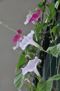 朝顔はラッパのような形を横から撮ってもきれいに撮れます。作例4は作例1の右上のほうにある二輪の白い花を下からあおるように撮ったものです。このままだと白い背景に白い花が重なって、いまひとつ花が引き立ちません。そこで右側に移動して、斜め上に向かって撮ったのが作例5です。白い花だけでは色が寂しいので、赤い花が後ボケに入るようにポジションを調整して撮りま した。
