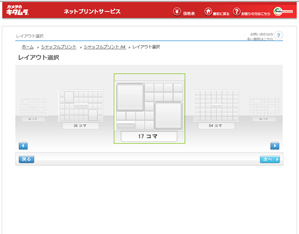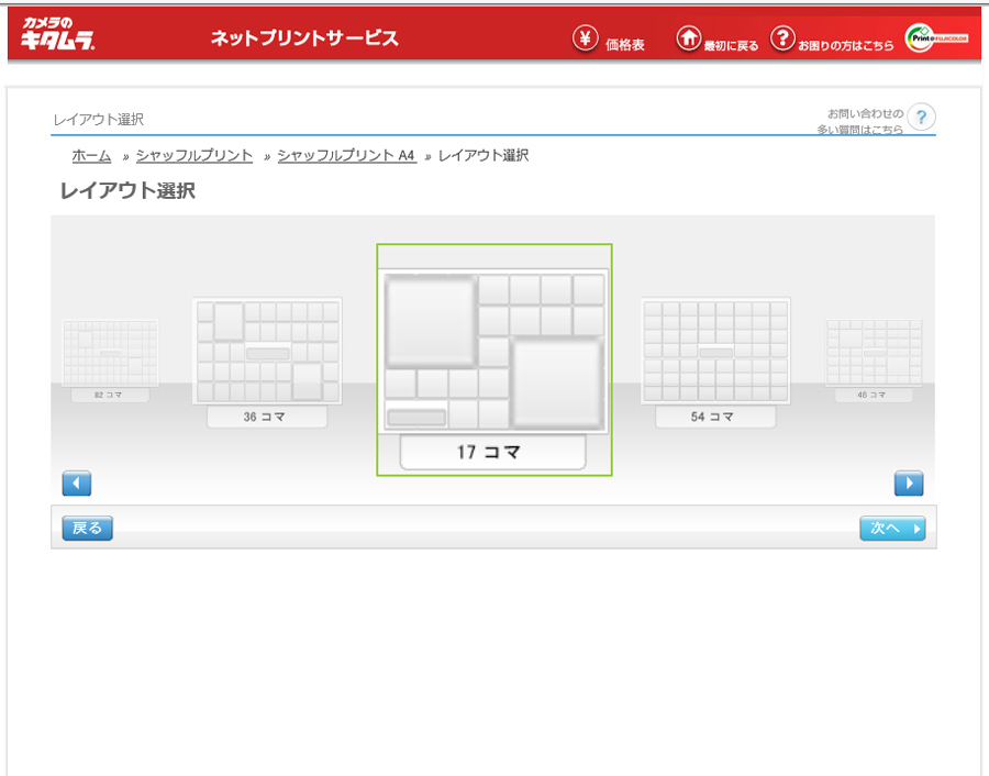 キタムラのHPのプリントサービスからシャッフルプリントを選びます。大きさと背景の色を決めたらレイアウトを選びます。大きい写真と小さな写真でメリハリをつけたかったので今回は17カットの写真を使うことにしました(写真1)。ここまでやったらネットのほうはちょっとお休みです。