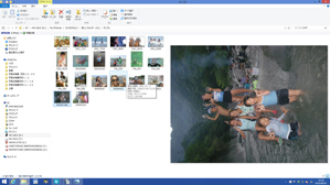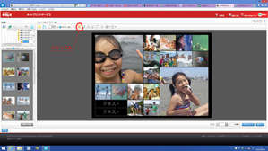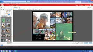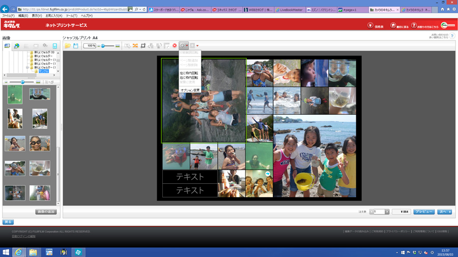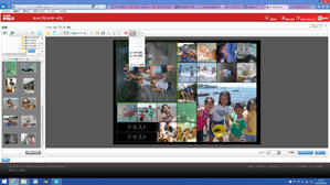 だいたいOKですが大きくしたい写真が思い通りの大きい枠にレイアウトされていませんでした。写真を入れ替えたいのですがレイアウトされた写真を入れ替えることはできません。左の写真の中から画像を追加する形で配置を変えていきます。左の写真から大きな枠に入れたい写真をマウスでずるずる引きずって持ってきます(写真4)。この時プリントしたい写真がバラバラのフォルダに入っていると、いちいちフォルダを移動しなければならないのでかなり面倒です。最初に一つのフォルダに写真をまとめておいたほうがいいと書いたのはこの手順のためです。小さな枠の写真も同じ方法で配置をしていきます。また、縦位置の写真が横向きに入っているものもあるのでそれを直します。回転させたい写真を選択して上の歯車型のアイコンから回転を選んで縦横を直していきます(写真5)。