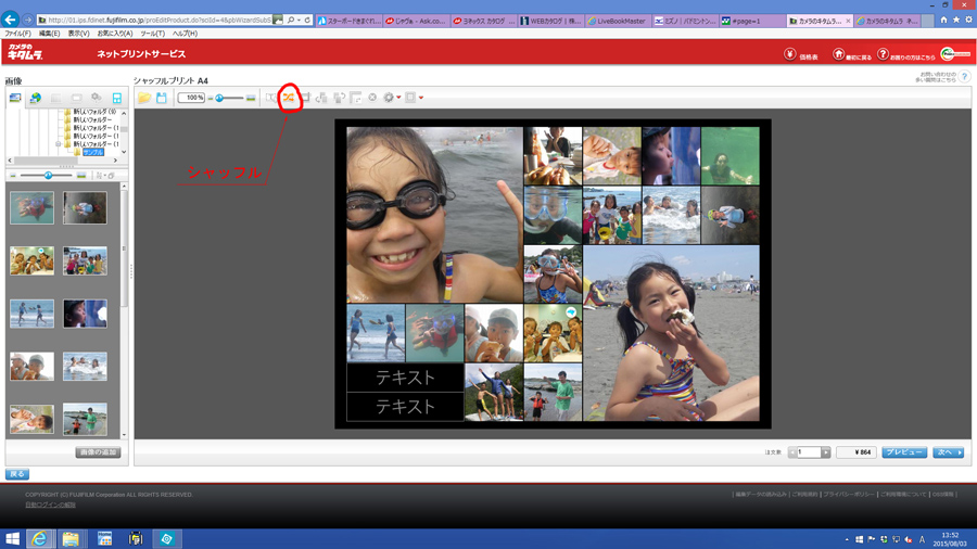 写真を選択して先に進んでいくとさっき選択したレイアウトに写真が自動的に配置されます。この時配置が気に入らなかったら画面上のシャッフルのアイコン(写真3)をクリックすると、また自動的に写真の配置がかわります。
