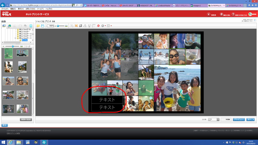 最後にテキストの部分をダブルクリックしてテキストを入力して編集は終わりです(写真6)。「2015夏休み」などテーマに添ったタイトルを考えましょう。後は写真をアップロードしてプリント注文を確定すればOKです。好みのフレームに入れてお部屋に飾って楽しみましょう。