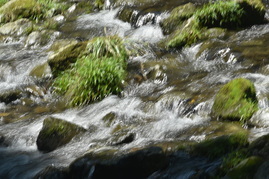こういった方法で水をブラすときは画面のどこかに動かないものを入れておくのがコツです。作例4は画面いっぱいに水の流れをフレーミングしてしまったので、画面全体がぶれてしまっています。こういう方法もダメとは言いませんが、なかなかきれいにまとめるのは難しいでしょう。作例5は川の石を入れてフレーミングしています。このように画面のどこかにぶれないもの、つまり動いていないものを入れておくのがコツです。ひきで川全体を撮るなら岸の風景なども入れて撮るといいでしょう。