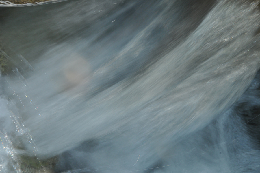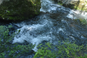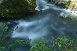 作例2はシャッター速度1/100秒で撮った写真です。高速というほどのシャッター速度ではありませんが見た目の印象通りに撮れています。作例3のほうはシャッター速度1.6秒です。こちらは水の流れの泡立った部分が白くぶれて煙のように写っています。このように低速シャッターで水をブラすことで見た目とは違った印象の写真を撮ることができます。渓流や滝などの写真で、水が部分的に白く煙のように写っているのはこのように低速シャッターを使って撮った写真です。どの程度の低速にすればよいかは、流れの速さやどの程度ブラしたいかによって違うので一概には言えませんが、デジカメの場合モニターでたいたいの写りを確認することができますから、モニターを見て自分が撮りたいイメージになるようにシャッター速度を調節して撮ってください。