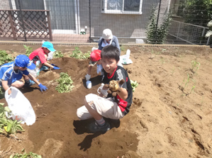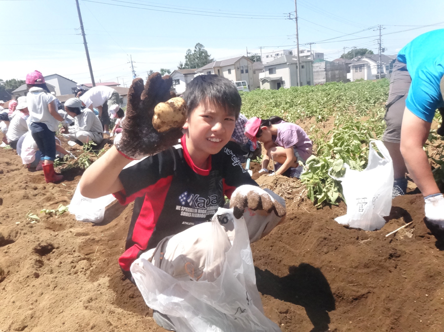 作例1と作例2は同じときに撮った写真です。畑の端のほうで掘っていたため、畑のほうから端のほうに向かって撮ると、背景に隣のマンションが迫っている状態が写ります。本当は結構広いジャガイモ畑なのですがこれだとなんだか空間が狭く感じられる写真になってしまいます。そこで反対側(畑の端のほう)に回り込んで背景に広い畑が入るように撮ったのが作例2です。こちらのほうが広い畑で収穫しているイメージが伝わります。このようにできれば背景に気をつけてどんな場所で採っているのかがよりよく伝わるように撮りましょう。背景は写真の印象を大きく左右するのでどちらから撮るのかはとても重要です。また、周りの状況を入れて撮るならレンズは広角を使いましょう。ズームの広角側でもよいと思います。子供を大きく写したいなら、ズームでアップにせず、広角のまま自分が近づいて撮るようにしましょう。
