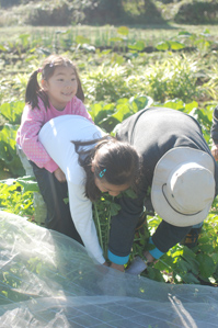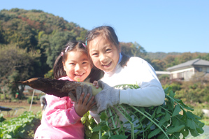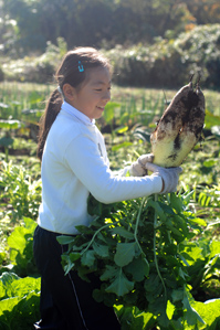 収穫のスナップでは、収穫した野菜などをもっているカットは外せません。作例4は「大根見せて」と声をかけてカメラのほうを向いてもらって撮りました。収穫した大根を持っていることで子供たちの表情も楽しげです。自分で採ったという気持ちがあると、自然と表情御明るくなるので、その瞬間を逃さないようにしましょう。さらに手に持った野菜をカメラのほうに突き出してもらって撮ると野菜が大きく写るので、インパクトのある写真になります。その場合はコンデジかスマホのように撮像素子の小さいカメラのほうが全体にピントが合い、野菜も子供もシャープに撮ることができます。また、望遠で離れたところから自然な表情を狙うのもいいと思います(作例5)。カメラ目線の写真とはまた違ったナチュラルな笑顔を狙いましょう。