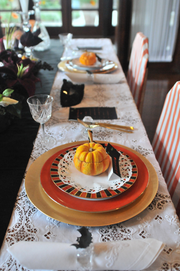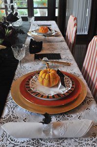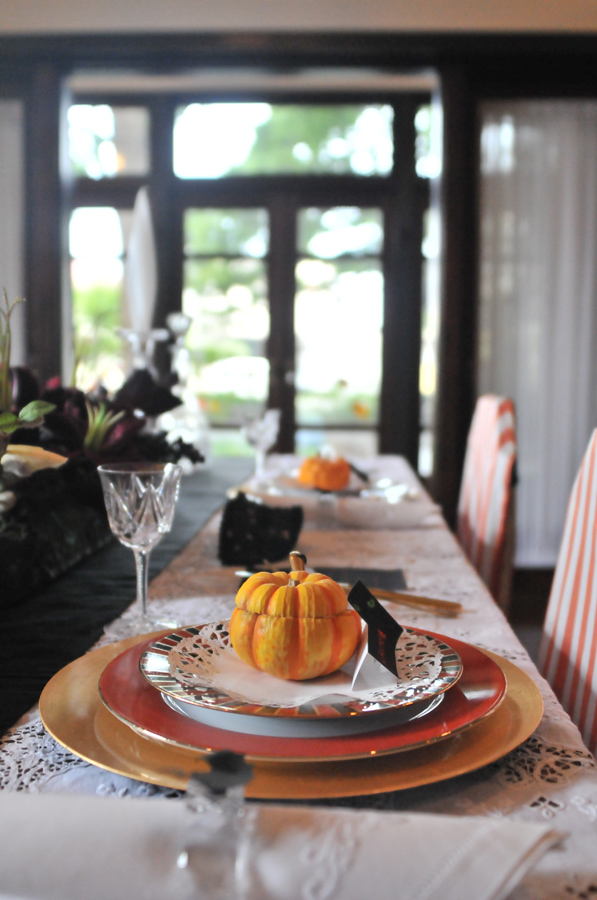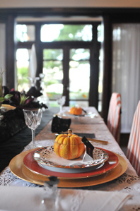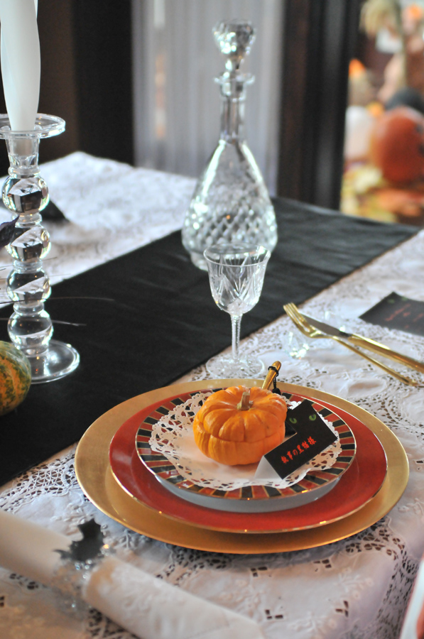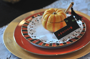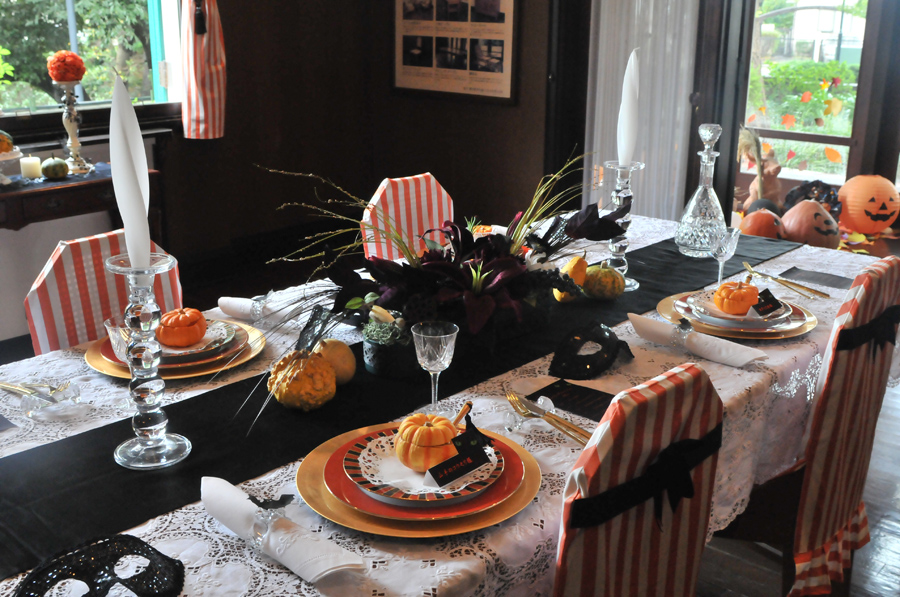 このイベントの飾りつけは毎年テーブルセットがメインな感じなのでテーブルセットを撮ってみました。作例1はテーブル全体の様子です。ハロウィーンなのでカボチャがいろいろなところに飾られていますがこのテーブルセットにもカボチャが使われています。テーブルセットをメインに撮るとして、全体ワンカットで終わらせずにいろいろなパターンで撮っておきましょう。アップにしたりちょっと引いて撮ったりアングルを変えて撮るといろいろなバリエーションで撮ることができます。