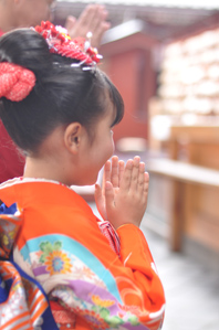 七五三に限らず子供の写真を撮るとき、たまに「手がかわいいな」と思うことがあります。大人の手とちがって丸い子供らしい手には豊かな表情があります。作例3は子供がお参りするときに手を合わせたところを撮りました。両手を合わせた様子がかわいらしかったので手を主役にするため絞りを開けてピントを浅くしました。ピントは手に合わせ背景をぼかすと主役感が増します。この時手を主役にするためには顔がはっきり見えない角度から撮ったほうがいいでしょう。人の顔、特に目が写っているとそちらに注意が集中してしまいます。人の顔は当然手よりもインパクトがありますから顔が写っているとそちらのほうが目立ってしまうためです。作例3は斜め後ろの角度から撮っています。横顔が見える真横よりも鼻がぎりぎり見えないくらいの斜め後ろくらいから撮るとちょうどいいと思います。
