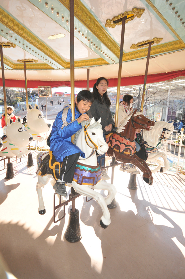 メリーゴーランドはどの遊園地にたいていある乗り物です。うちではダンナが絶叫系絶対拒否派なので、パパと一緒に乗れる数少ない乗り物の一つです。メリーゴーランドで子供のスナップを撮る時は一緒に乗ってしまって、乗り物に乗った状態で撮るのがおすすめです。外からでも撮れないことはありませんが、回ってくるのを待たなければなりませんし、回ってくる自分の子供をファインダーで追うのは結構大変です。一緒に乗ってしまえばそれほど追うのに困るスピードにはなりません。乗る場所は、もちろん子供たちの後を追うポジションではなくちょっと前のポジションに乗りましょう。できれば馬よりも馬車の座席のような安定したポジションがおすすめです。作例1は子供の内側前方の乗り物に乗って、斜め後ろを振り向きながら撮った作例です。露出補正なしで撮ったので、暗く写ってしまいました。露出補正すれば明るく撮れますが、手っ取り早いのはストロボを使って明るく撮る方法です。この時も乗り物に乗りながら露出補正をセットするのが面倒だったのでカメラの内臓ストロボをポップアップさせてそのまま撮りました(作例2)。今の一眼レフなら内臓ストロボを出しただけで適切な露出をカメラが選んでくれるので簡単です。また、この一緒に乗って撮る方法ならコンデジやスマホでもそれなりにきれいに撮ることができます。