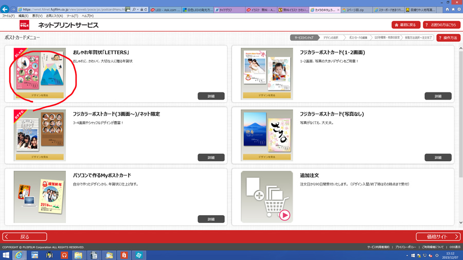 ポストカードメニューを選択します。今回はおしゃれLettersを選択しました。このメニューはちょっとおしゃれなデザインのテンプレートがたくさんあってきれいな年賀状が作れます。