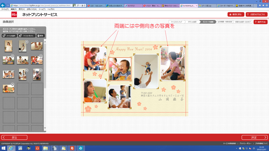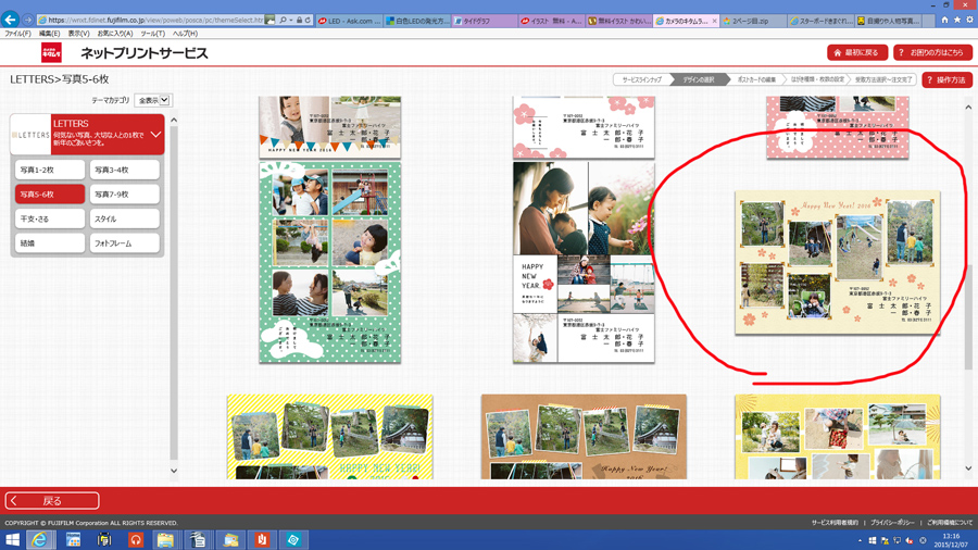 私もその一人ですが、なんか自分の写真はあんまり載せたくないと思う人もいるのではないでしょうか。一方、「子供の写真じゃなくて本人がどうしてるのか知りたいのよ」と言う声も聞いたことがあります。複数の写真を載せるタイプなら、自分の写真は小さく載せればいいだけです。まずは年賀状に載せる写真をいくつか選んで一つのフォルダ(仮に年賀状フォルダとします)にまとめておきましょう。