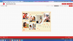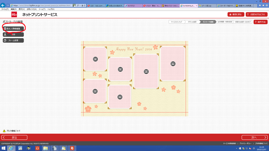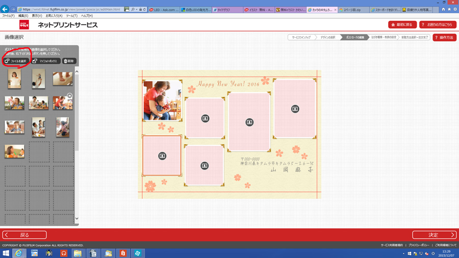ここで差出人情報を入植します。字のタイプや色も指定できます。また、選んだテンプレートの写真枠内をクリックすると写真をその枠に挿入したり入れ替えたり、編集したりすることができます。
