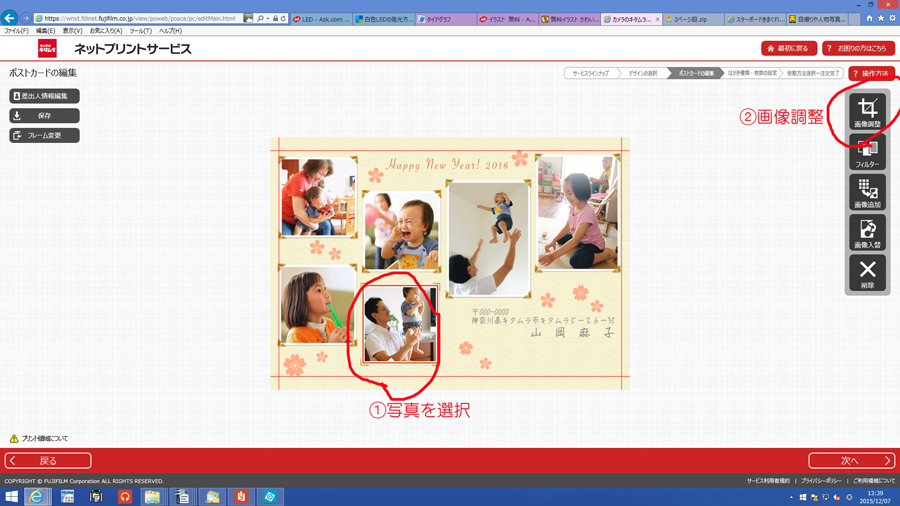 このままだと左下のお姉ちゃんは後頭部が切れてしまっているし、中央下の弟君も頭が切れています。そこで、一旦戻るを押して写真を選択したら画像調整をクリックします。そうすると位置調整ができますからそれぞれの写真がきれいにはなるように位置を調整しましょう。