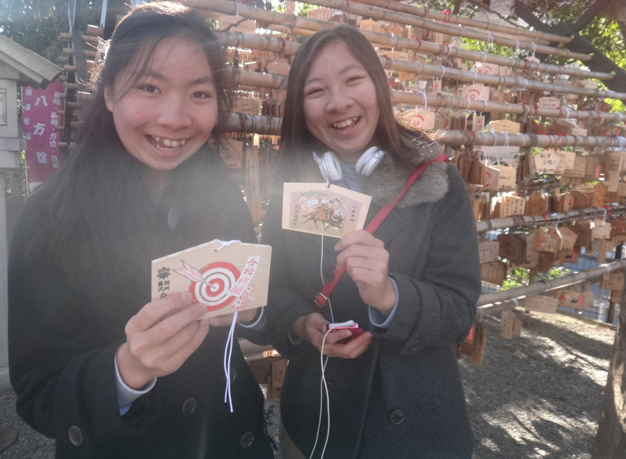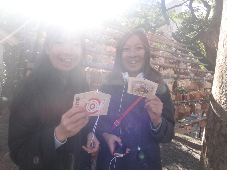 作例3は逆光で撮りました。逆光なら目が細くなることはありませんし、笑顔も引き出しやすくなります。ただ、この作例では画面に太陽が入ってしまい、その部分が飛んで白くなってしまっています。冬の太陽は位置が低いので、逆光の角度から撮ると太陽が画面に入りやすいので注意しましょう。そこで、一歩移動してレンズが小さな日陰に入るようにしました。(作例4)これなら背景に絵馬があり、なおかつ太陽も画面に入りません。日陰でもOKだと思いますが、その場合は背景と人物の明るさのバランスに気をつけましょう。