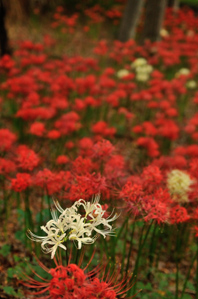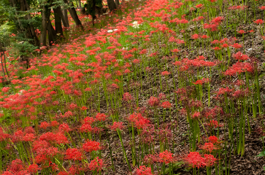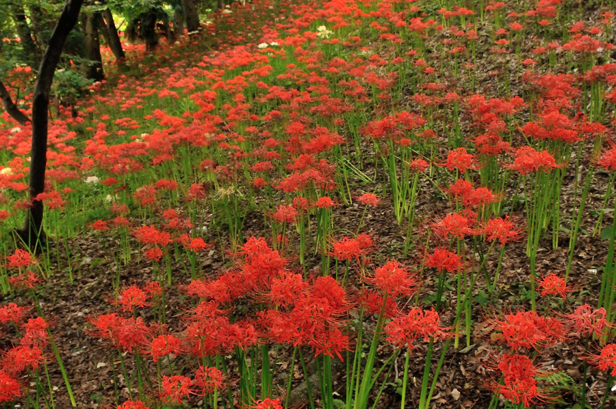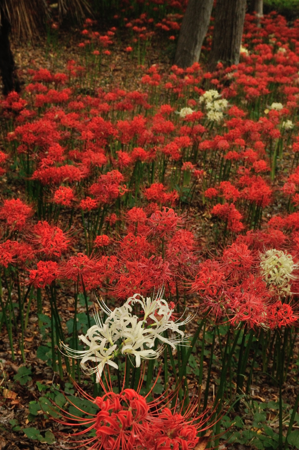 ヒガンバナは群生して咲く花です。たくさんの赤い花が一面に咲いている様子は力強く人目を惹きます。群生して咲く様子を撮るには引きで広い範囲をフレーミングして撮ることになります。花の写真を撮るときに気をつけなければならないポイントとして花の状態があります。群生している花の中にはきれいな状態で咲いている花だけではなくこれから咲く蕾やすでに終わりかけて枯れている花が必ず混じっています。これは撮りにいくタイミングに大きく左右されますが、すべての花が一斉に咲くわけではないので仕方がないことです。蕾はともかく枯れた花はなるべく画面に入れないにこしたことはありません。特に群生している様子を全体的に撮る場合、手前のほうの花は目立つのでこの手前側にきれいな状態の花を入れることが大事です。作例1は手前右側に枯れた花が何本か入っています。これだと枯れた花が目立ってしまい、きれいな群生のイメージになりません。一方作例2はなるべくきれいな状態の花が手前側に詰まっている場所を選んで撮った写真です。作例2の写真でも画面中央に近い部分に枯れた花の群れが入っていますが、作例1ほど枯れ花の印象は強くありません。このように群生している状態を広く撮るときはなるべく枯れた花を目立たせないようにするため、手前にきれいな花をフレーミングできるポジションを探すことが重要です。