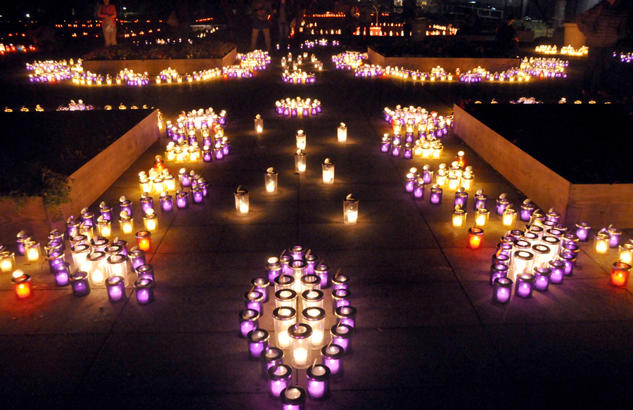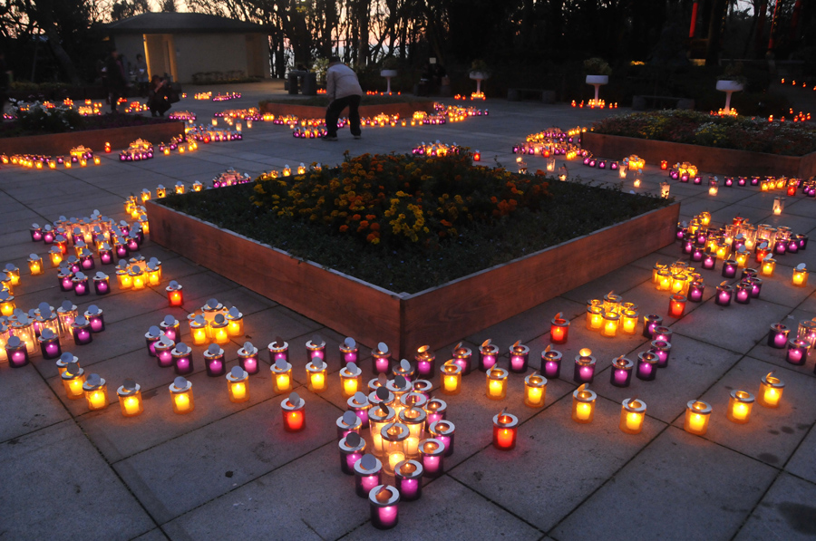 通常の夜景を撮るときは日没前から出かけて日没後まだ空に残照が残っているくらいからがきれいなのですが、これは夜景の写真にはたいてい空が入ってしまうからです。キャンドルの場合は光自体が弱いのと地面に並べてあることが多いので、空の残照はあまり関係がありません。むしろ周りの自然光にキャンドルの光が負けてしまうためある程度暗くなってからのほうがおすすめです。作例1は日没前後の時間帯に撮りました。まだ周りが明るいのでキャンドルの光が周りの明るさに負けてしまい、あまり引き立っていません。作例2のほうはその15分後に撮りました。日没後は思いのほか暗くなっていくスピードが速く、たった15分の違いでもかなり違うイメージになるのがわかると思います。すっかり日が暮れて暗くなった後に撮ったのが作例3です。あたりはすっかり暗くなっているのででキャンドルの光も、キャンドルの光が落ちた地面がほんのり明るくなっているのもよくわかります。