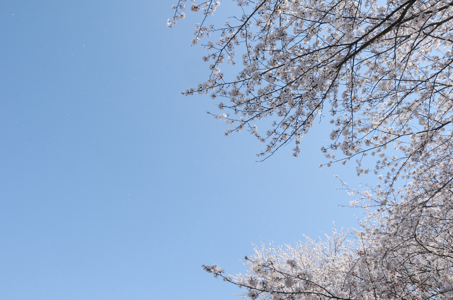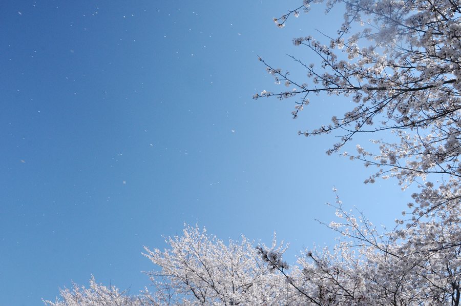 そこでPLフィルターを使って空の色が濃く写るようにしてみました(作例2)。これくらい濃い背景なら花びらの白がわかりやすいと思います。また、散っている瞬間を撮るにはシャッターチャンスも大事です。なるべく花弁がカメラの近くに落ちてくる瞬間を狙うと、近い分花ビラが大きく写りますから、遠くのほうにある小さな花びらよりもインパクトの強い写真になります。