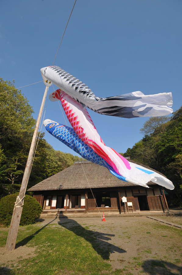 作例3は別の公園です。この公園には古い民家があり、その庭にこいのぼりが泳いでいました。趣のある民家なのでこの民家と一緒にこいのぼりを撮ってみました。まずは望遠レンズで遠くから撮ったのが作例3です。民家全体とこいのぼりが入るようにフレーミングして風が吹いてくるのを待ち、こいのぼりがうまく泳いだタイミングを見計らって撮影しています。全体にバランスよく民家とこいのぼりを組み合わせることができました