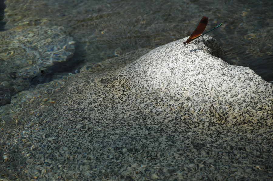 作例2と作例3は同じトンボです。しかし作例2は池の水面が暗いところに茶色の羽根が重なっているため、トンボの姿がわかりにくくなってしまっています。その虫の色などを考えて背景に同じ色が重ならないようにしたほうが主役の存在感が協調できます。作例3は作例2のポジションから移動して反対側の低いアングルから撮りました。この角度からなら重なっている背景が白っぽい岩なので、主役の姿が引き立って見えます。虫はすぐに逃げてしまうという印象から背景を考えずに慌てて撮ってしまいがちですが、とりあえず一枚撮ったら主役の見せ方を考えて別のポジションやアングルを探してみましょう。