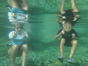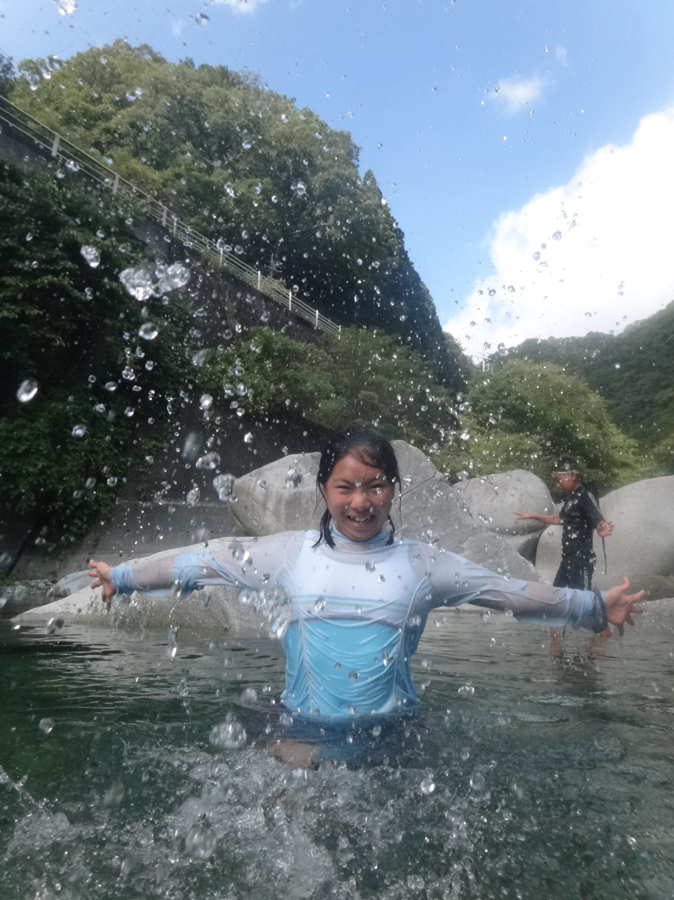 せっかくの防水カメラですから水中の写真もぜひ撮りましょう。当たり前のことですが水中で撮るなら水の透明度の良いところでないときれいに写りません。作例3は川で撮りました。海でも透明度のよいところなら十分きれいに撮ることができますが、なるべく近くで撮ったほうがよりきれいに撮ることができます。作例3くらいの水のきれいなところでも後ろのほうの岩などを見ると、やはりシャープに写っていないのがわかると思います。離れて撮るとその分カメラとの間にある水が厚くなるわけですから、その分透明度も落ちることになります。子供のスナップなどを撮るならなるべく日光の当たる明るい水中で近くから撮るのがおすすめです。