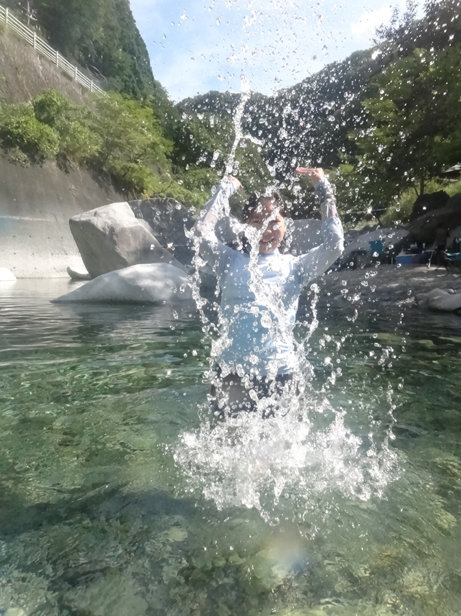私が持っていた防水タイプのコンデジを見て、知り合いのカメラマンが「へー、一台買ってみようかな」と言って、買ってはみたものの「怖くて水中に沈められない、だって海だよ、塩水なんだよ」と言っていました。心配ありません。そのための防水なんだから。「塩が気になるなら後で水道で洗えばいいじゃないですか」とアドバイスしておきましたが「ワイルドすぎて無理」と言われました。作例1は川で撮った写真です。普通ならカメラは濡れないように気をつけなければならない機材ですが、防水タイプのカメラなら濡れるくらいどうってことないので、子供に「こっちに向かって水をかけて」と頼んで撮りました。水を高く広く散るようにかけてもらってカメラに向かって落ちてきたタイミングで撮るのがコツです。シャッターを切るのが早すぎると作例2のように水滴が広がっていませんし、すくった水が子供にかぶって写ったりします。