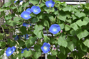 当たり前のことのようですが、撮影するには朝早い時間がおすすめです。朝顔は朝咲きますが、すぐにしおれてしまうわけではなく、お昼くらいの時間帯でも十分普通に咲いています。では撮るのもお昼ぐらいで問題なさそうな気がします。しかしお昼近い時間帯だと、アップにしたときに微妙に花や葉がくたびれていたり、日が高くなって直射日光が当たってしまったりと、いろいろ不都合なことがでてきます(作例1)。必ずしも日の出直後などである必要はありませんが、遅くても9時くらいには撮ってしまったほうがいいと思います。