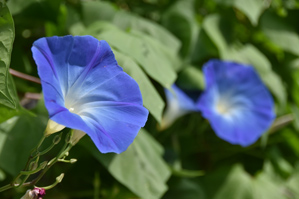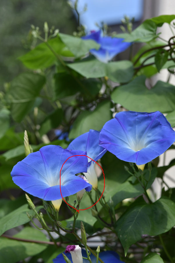 アサガオの繊細なイメージを出したい場合は直射日光の当たらない時間帯を選ぶか、プランターなら日陰に移動して撮るのがおすすめです。直射日光が当たっているとなかなかアサガオの薄い花びらの質感を出すことができません。直射日光の硬い光は色をきれいに出すにはよいのですが質感を大事にしたい場合は強い影ができてしまうためあまりよい光泉状態とは言えません(作例3)。