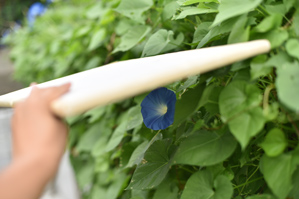 花の撮影全般に言えることですが、風に強い日はあまりお勧めできません。花が風にあおられて撮りにくいということもありますが、特にアサガオは花びらが薄く傷つきやすいので、風にあおられているうちに花びらが破けてしまうことが多く、アップにしたときに傷が目立つことが多いからです。花の写真を撮るときは花がきれいな状態であるかどうかが大事なので、風のない日がおすすめです。(作例2)