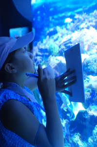 水中は青い世界ですから水族館には青が似合うと思います。作例4は人物の写真ですが、水族館らしいイメージを出すためにわざとWBをタングステンにセットして青がかぶるように撮ってみました。もちろんノーストロボです。人物の写真も、横から撮ると水槽からの光でいい感じのサイド光になりますから、ここはノーストロボのほうが、雰囲気が出ると思います。夏休みの宿題のためノートにメモをとっているところを横から撮りました。実際にはここまで青の強い光ではありませんでした。おそらく白色光で展示されていた水槽だと思います。しかし、こうして青をかぶらせてもそんなに不自然な感じにはなっていません。むしろ水族館らしい雰囲気が出ていると思います。