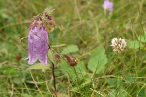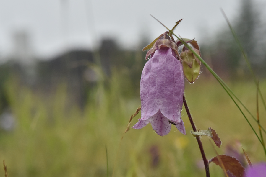 ケーブルカーで上った高原でホタルブクロを見つけました。山に咲く花は派手なイメージはありませんが可憐でありながら強さを感じさせるところが私は好きです。とりあえず普通に撮った場合、このような感じで撮っている方が多いのではないかと思われるのが作例1のような感じです。立ったまま、見つけた花にレンズを向けてそのまま撮るとこんな感じになります。しかし、このままではあまりにインパクトがありません。このように背の低い草花は立ったまま撮るとそれだけでカメラから距離ができてしまいます。その結果花が小さくしか写らないのでイマイチ印象の薄い写真になってしまうことがよくあります。とりあえずは寄ってアップにしてみましょう(作例2)。