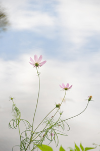 作例4はコスモスです。私の地元では、というか普通はコスモスと言えば秋の花だと思いますが、涼しい高原ではそうとは限らないらしく、真夏の8月中旬に咲いていました。このコスモスは湖のほとりに咲いていました。この日は風がほとんどなく、水面が凪いでいたので、湖面には青い空と白い雲がけっこうきれいに映りこんでいました。この映り込みを背景にしてコスモスを撮ってみました。ローアングルから撮って背景を空にぬくのも一つの撮り方です。しかしここではちょっと柔らかいイメージにしたかったので、水面に映りこんだ空を背景にして明るめにハイキーな感じで撮ってみました。水面に映った空は本当の空よりも優しい色になるので、ソフトなイメージに合っていると思います。