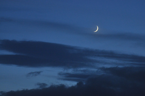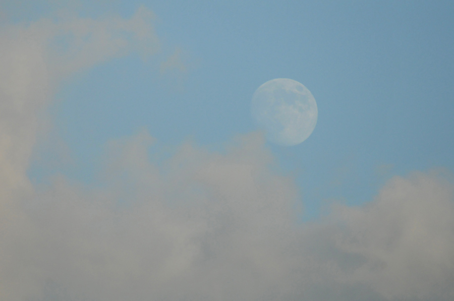 月にはクレーターがあり、そのパターンが月の特徴にもなっています。作例1では月はただの白い丸になって写っています。すっかり暗くなってからこの月の表面にできたパターンを撮るには露出をカメラにおまかせで撮るのではなくマイナス補正しないとうまく写りません。作例4は作例1と同じときに撮りましたが-2.3補正をかけています。その分暗く写るので月のクレーターの模様がわかる程度のトーンになっています。また、月のクレーターのパターンを残すにはまだ明るい時間帯に撮るという方法もあります。作例5は夕方日没の後、まだ空が真っ暗になる前に撮った写真です。一緒に写っている雲は夕焼けで赤っぽく色づいているので白い月との対比もよい具合になっています。真昼の月を撮ってもいいと思いますが、白い雲と白い月を一緒に写すよりこの時間帯に撮ったほうが色の変化をつけやすいと思います。