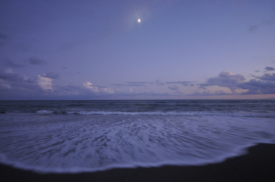 地上の風景と組み合わせるという方法もあります。作例3は海で撮った写真です。これは12ミリの広角で撮っています。地上の風景と組み合わせるには、広角レンズがあったほうが便利です。もちろん月が低い時間帯であれば地平線(または水平線)の近くに月がありますから、望遠で近くのものと組み合わせるということができます。しかし月が高い時間帯に撮るなら、木など背の高いものと組み合わせるか、広角で地上の風景と月を一緒に写しこむしかありません。どんな風景と組み合わせるかは状況により違いますが作例3のように月が小さく写るフレーミングで撮る場合はシンプルな風景を選んだ方が、月が引き立ちます。