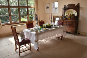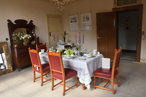 いつも行く洋館ですが飾り付けのメインはテーブルセットでした。燭台や食器などがハロウィンのイメージでまとめられています。インテリアなどを撮る場合昼間であればやはり窓からの自然光をメインの光に使って撮ると撮りやすいです。照明に凝った演出があれば夜の内装も絵になりますが、必ずしもそういった場所ばかりではないのでとりあえず昼間に行って自然をメインに撮りました。作例1は大きな窓のある部屋で、窓からの光を背にして撮りました。つまり順光の方向から撮っています。この状態だと、窓から光で手前は明るく、奥の方は暗く写ります。この撮り方のほうが家具や飾り付けの色は見た目に近い印象で撮ることができるのですが、ちょっとべたっとした印象の光になってしまいます。