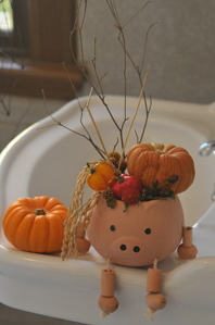 作例3は浴室にあった洗面台に座っていた素焼きの飾りです。カボチャの飾りを頭にのせて、さらにオレンジ色のカボチャの隣に座っていました。カボチャはハロウィンのイメージを盛り上げる象徴的な素材なので、画面にひとつ入っているだけで写真がハロウィンっぽい感じになります。この場合は作例とは逆に絞りを開けて撮ったほうが、背景がぼけて主役が引き立ちます。また、作例2同様に窓からの光を逆光にして撮っています。絞りを開けてアップで撮るとピントが合う範囲はかなり狭くなります。ピントはブタさんの顔に合うようにしました。主役ですし、このフレーミングで顔にピントが合っていないと他のところにピントが合っていてもピンボケの印象になってしまいます。また、室内でアップを撮るときはブレにも注意しましょう。ISO感度を上げるとか手ぶれ補正機能を使う等のブレ対策が必要です。