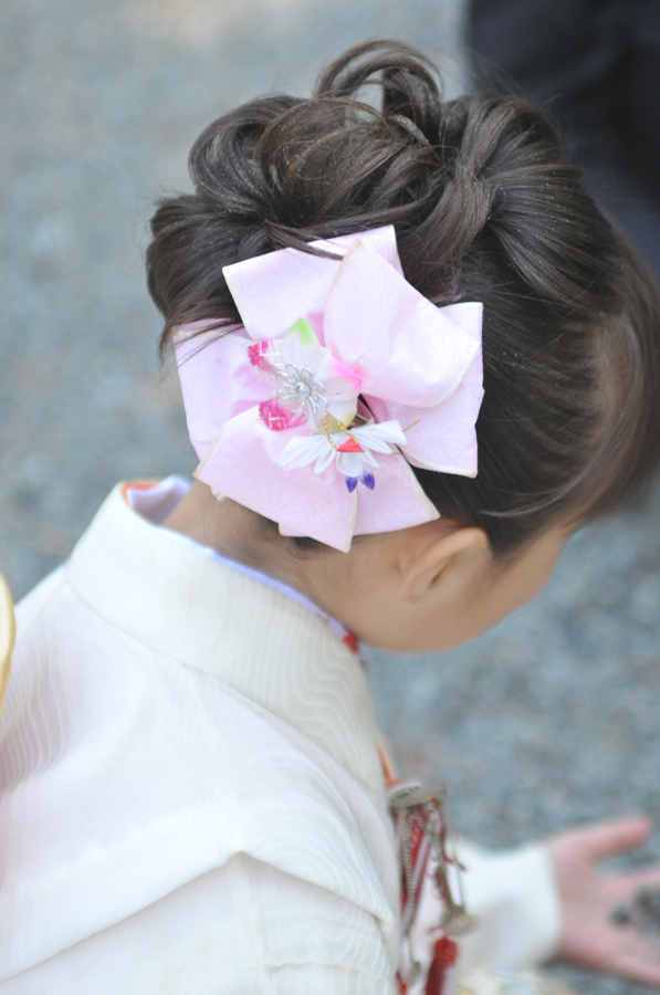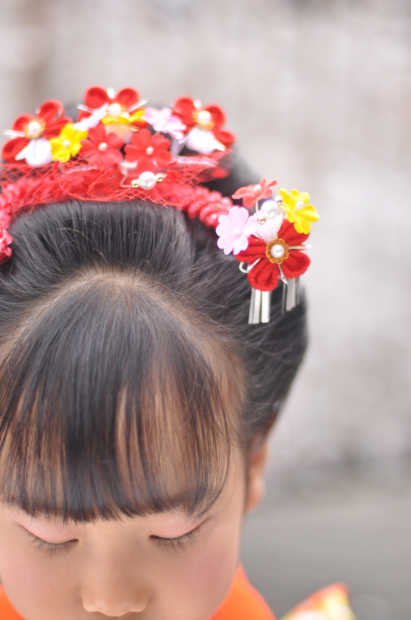 七五三の着付けには小物がいろいろ使われています。私の子供たちの時は着物もそうですが髪飾りや帯も、私や妹たちが着た着物と帯を使い、小物も母が全部取っておいてくれたのでそれを使いました。こうした細かいものも思い出の一つです。小物のアップなども撮っておくとよい記念になります。髪飾りはヘアメイクのデザインにもよりますが、前からだけでなく後ろから撮るのもいいと思います(作例1)。ヘアメイクの写真を撮るときのコツはやや高めから斜めに見下ろすように撮るとヘアスタイルがきれいに見えます。ヘアカタログなどもたいていはちょっと上から撮っている写真がほとんどです。アイレベルから撮るよりも髪のデザインがわかりやすいからだと思いますが髪飾りを主役にしながらヘアスタイルをきれいに撮るにはこのアングルがおすすめです。