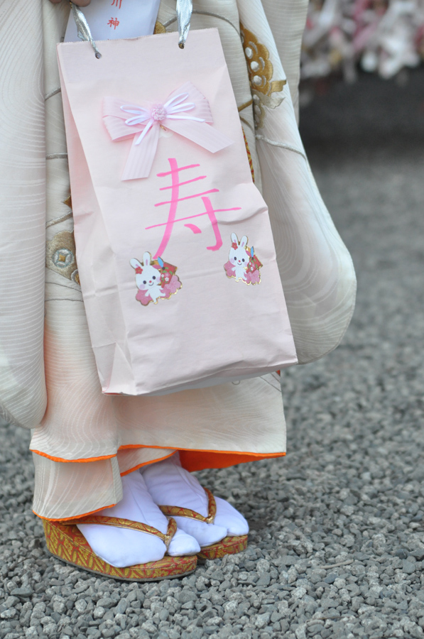 七五三と言えば千歳あめは定番の脇役です。この時はおばあちゃんが手作りで千歳あめの袋を作ってくれていたのでこの袋もアップで撮っておきました。こういった小物も撮っておくことはあってもしまってあったのをとりだして眺める機会などなかなかありません。写真に撮っておけばアルバムを開くたびに眺めることができるので、こういった手作りのものなどはぜひ撮っておきましょう。(作例3)