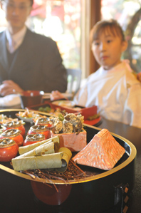 七五三のお参りの後に家族でお食事に行く人が結構多いようです。作例4はこのお食事の時のスナップです。秋らしいお料理が出たので料理の写真も撮ったのですが、料理だけの写真のほかに背景に子供を入れて撮ってみたのが作例4です。もちろん料理だけで撮るのもありですが、背景に子供を入れることで、写真全体を七五三のイメージにすることができます。ピントは料理に合わせて子供の姿はぼけるようにするとちょっとおしゃれなスナップにすることができます。