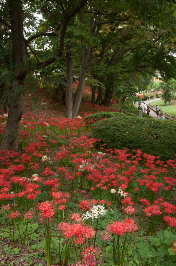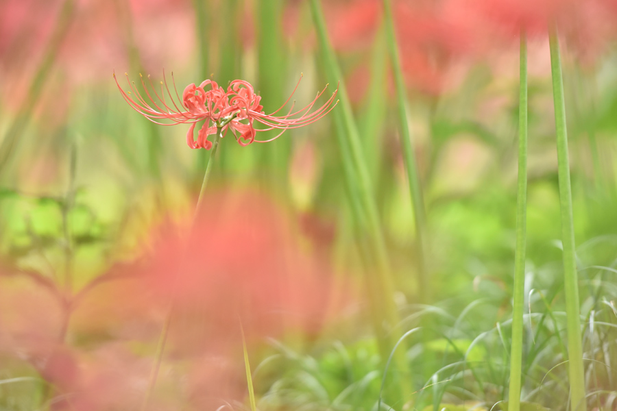 ヒガンバナは群生して咲く花なので、写真を撮りに行く人が訪れるような場所はたいていたくさんのヒガンバナが咲いているという状況だと思います。群生している様子を広く写しこみたい場合は手前に中途半端なボケを作らないようにすることです。意図的に入れる前ボケなら別ですが広い範囲を写しこむ場合、写真になったとき手前のほうはけっこう目立つので、ここがぼけていると写真全体がピンボケの印象になってしまいます。作例1で言うと手前側の白い花の周りくらいでしょうか。このフレーミングで、例えば中央のAFフレームでピントを合わせて、そのまま撮るとたぶん手前の白い花のあたりはピンボケになってしまいます。どこまでシャープに写るかはレンズの長さやどの程度絞るかにもよるので一概には言えませんが、プレビュー機能などを使ってピントがどこまでくるかを確認するとか、撮った後にモニターで拡大してみるなどしてピントを確認するといいと思います。