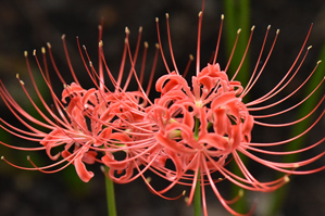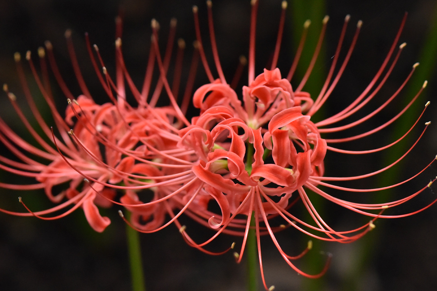 おそらくご質問の趣旨は寄って撮るときのピント位置についてだと思います。普通、花の写真をアップで撮るときは「シベにピントを合わせる」と言うのが花の写真の基本となっています。しかしヒガンバナの場合、シベが長く360度の方向に出ているのでシベにピントを合わせるよりも手前側の花弁にピントを合わせたほうが安定した絵作りができると思います。作例2はちょっと寄って花をアップにした写真です。手前側の花弁にピントを合わせて撮りました。この時は105ミリのマクロレンズを使って絞りはF4で撮っています。寄って撮るほどピントは浅くなります。作例2では奥の花弁や手前に伸びたシベの先はぼけていますが、写真全体としてみたときにピンボケと言う印象にはなっていません。一方作例3は後ろのほうの花弁にピントが合っています。この状態だと一番目立つ手前の花弁がぼけているため写真全体を見たときに「これピントぼけてない?」という印象になってしまいます。