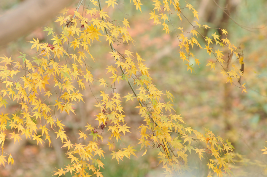 赤い紅葉にはマイナス補正が適切な場合が多いのですが、黄色い色にはプラス補正がおすすめです。黄色はかなり明るい色なので、露出補正なしで撮ると見た目よりも暗くなってしまうことが多いからです。作例4は黄色く色づいたカエデです。この時は薄い曇りでフラットな光線状態でした。主役のカエデと背景の明暗差もほとんどなく柔らかいイメージにあう状態でした。ここでは明るい黄色を利用して、ふわっとした明るい写真にしようと思いました。そこで+1補正して全体に明るい感じの写真にしてみました。明るいイメージにするには画面内に暗い部分がなるべく入らないようにフレーミングすることが大事です。黄色い黄葉を主役にして明るい背景を使うと優しいイメージの黄葉の写真を撮ることができます。