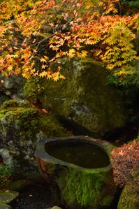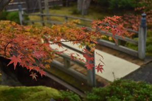 庭園にはその場のイメージに合ったアイテムがたくさんあります。私が行った庭園には苔むした岩や池、小さな滝などもありました。庭園内を歩くための遊歩道もアスファルトなどではなく石畳でしたし、池にかかる橋も木製で(見えるところは)紅葉の脇役として十分なものがたくさんありました。作例1はカエデの木の下にあった鉢を一緒に撮りました。木をくりぬいた鉢に水が溜まっていて(わざとだと思いますが)苔むした岩と一緒に撮ると風情があります。主役はカエデなのでピントはカエデに合わせましたが、フレーミングは鉢がちょうどいい具合に入るように考えて撮りました。また、作例2は橋を背景に入れてカエデを撮っています。