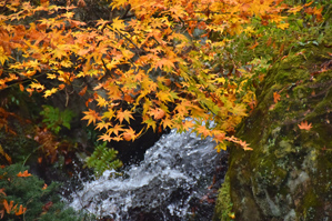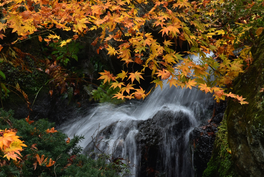 庭園内に小さな滝が作ってあり、池に流れ込むようになっていました。この滝を脇役にして撮ってみたのが作例3と作例4です。カエデにピントを合わせて撮ると滝がボケます。水を撮るとき高速シャッターで撮る方法もありますが、作例3のように滝が中途半端にぼけるくらいならスローシャッターにして白く流したほうがきれいに見えます。作例4は1/30秒のシャッター速度で撮っています。三脚が使える場所ではなかったので手持ちで撮りましたが長いレンズを使っていたので手ぶれ補正機能を使ってもこれくらいにしたほうが無難かな、と思います。見てわかる通り作例4の方は水がぶれて白く流れています。このほうが脇役としては目障りにならないと思います。三脚が使えるような状況であればさらに低速シャッターを使ってもっと柔らかい感じでブラすことができます。このように庭園では周りの人への配慮が必要ですが、小さなスペースの中に絵になる風景がたくさんあるので写真を楽しむにはいい場所だと思います。紅葉のタイミングを見計らって楽しく撮ってみましょう。