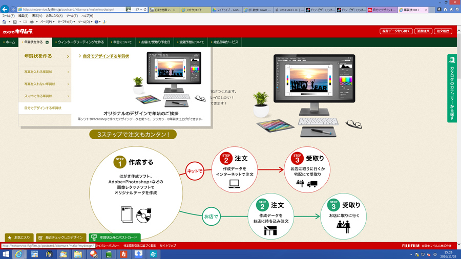 キタムラのHPを見ると年賀状用のテンプレートがたくさんあって、好きなキャラクターを使ったものも選べるし、ソフトなイメージのおしゃれなデザインのものもたくさんあります。もちろんこういったテンプレートを使えば簡単に気に入ったデザインができると思うのですがオリジナルっぽいものを作りたいと思ったので「自分でデザインする年賀状」を選択してみました(画像1)。